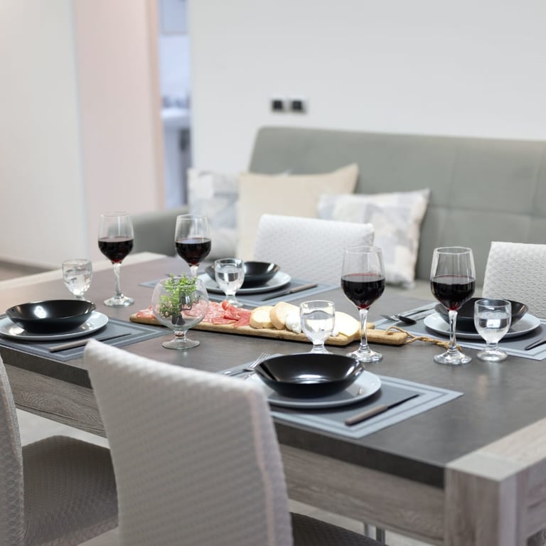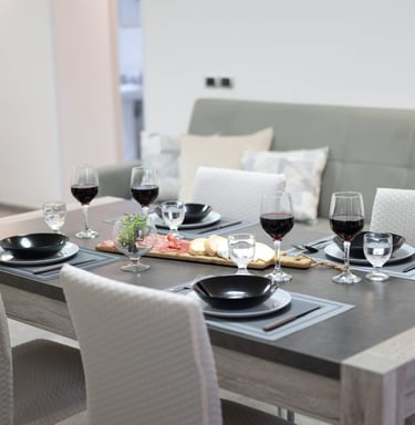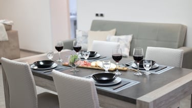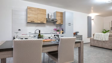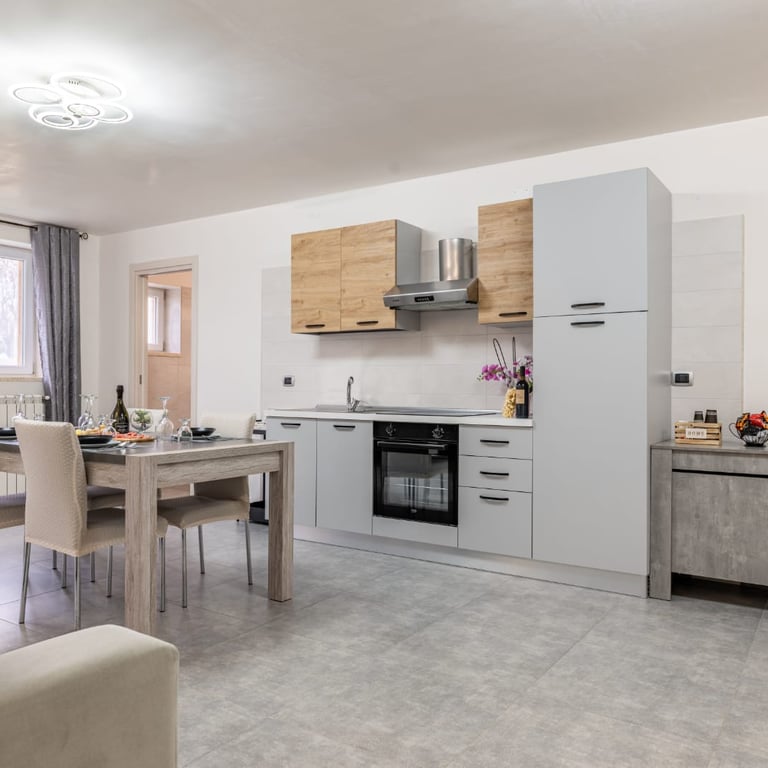 Un ampio soggiorno luminoso accoglie momenti di relax e convivialità, mentre la zona pranzo invita a condividere cene e chiacchiere in un’atmosfera familiare.